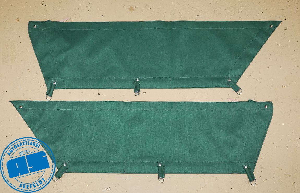 1 Paar Seitenplanen für Trabant Kübel in halbhoher Ausführung. Mit allen Befestigungen. Dreilagiger Verdeckstoff in NVA-Grün.