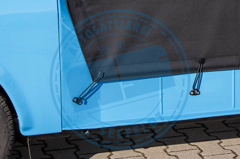 Komplettsatz mit 6 Spannseilen inklusive Klemmverschluss. Sie dienen zur Befestigung der Verdeck-Seitenteile unten am Fahrzeug.